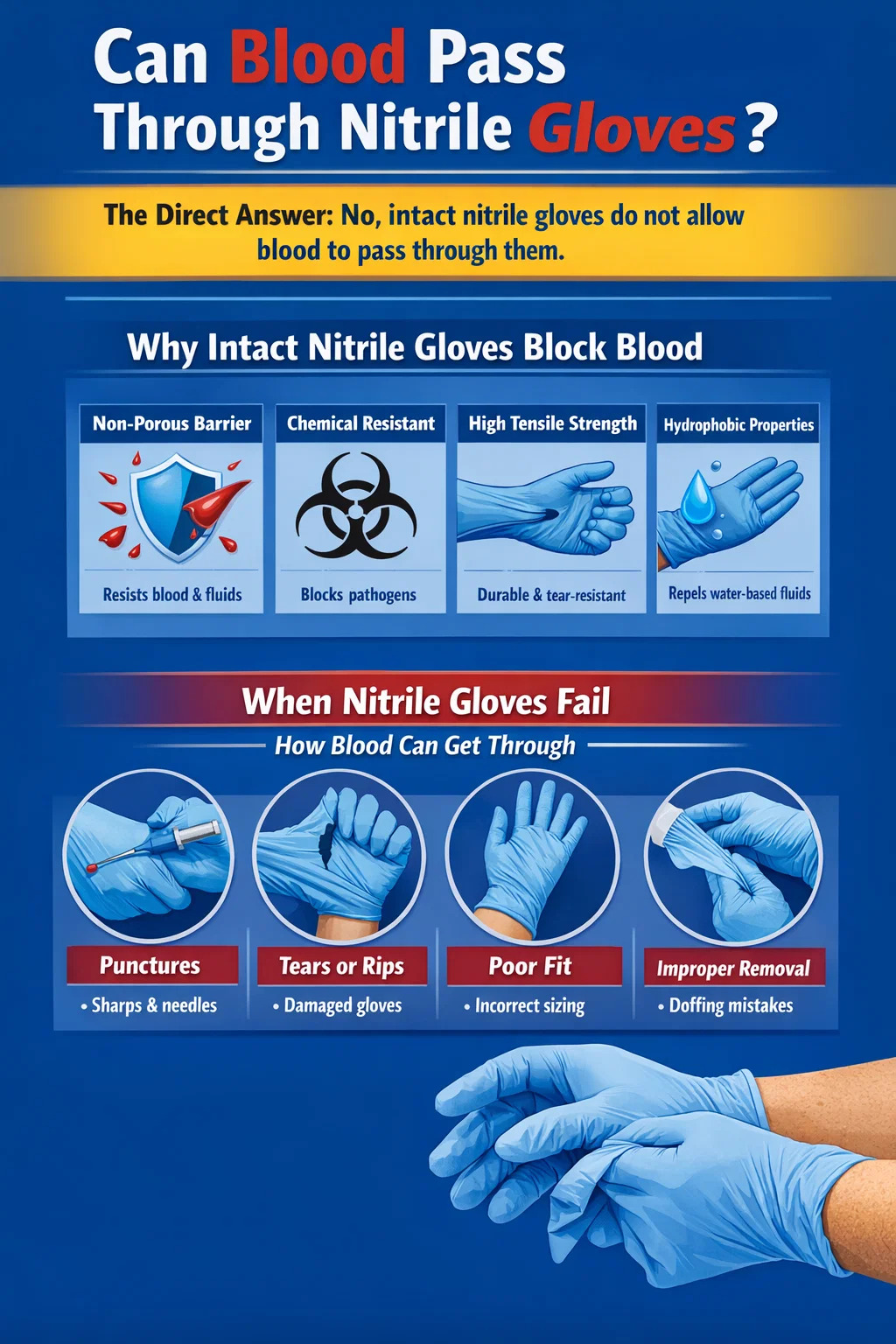 Tuy nhiên, từ "nguyên vẹn" có sức nặng rất lớn trong câu nói đó. Máu - hoặc mầm bệnh có thể chứa trong đó - có thể dính vào da bạn nếu găng tay bị rách, thủng, có lỗi sản xuất không được phát hiện hoặc được sử dụng không đúng cách. Bản thân chất liệu găng tay không hấp thụ hoặc cho phép máu thấm thụ động trong điều kiện sử dụng tiêu chuẩn, nhưng những vi phạm vật lý sẽ thay đổi mọi thứ.