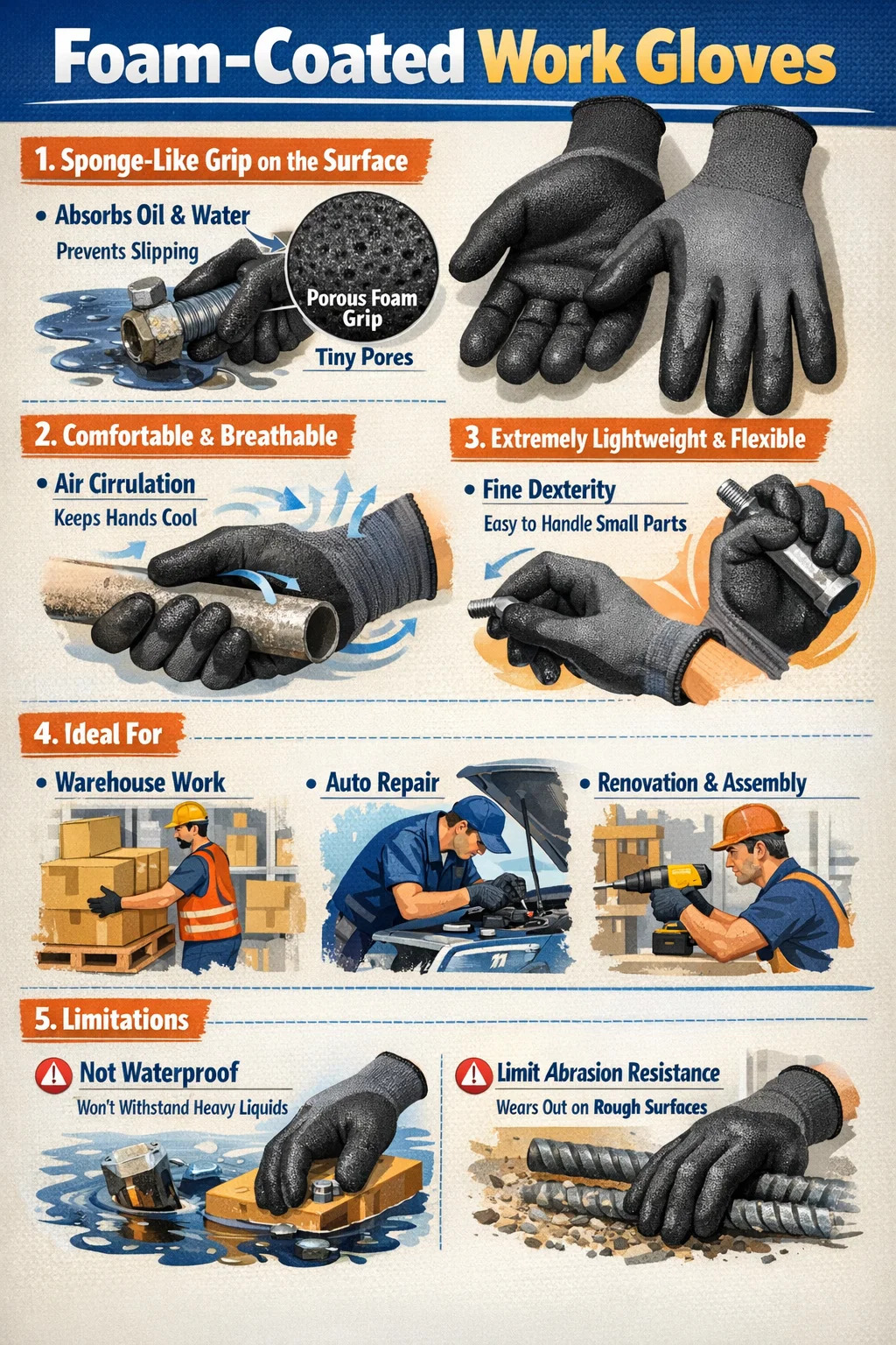 Lưu thông không khí: Vì lớp phủ được "tạo bọt" nên không khí có thể lưu thông qua các lỗ nhỏ. So với găng tay bằng nhựa hoặc cao su dày được bao bọc hoàn toàn, găng tay xốp mát hơn và giúp tay không bị dính.