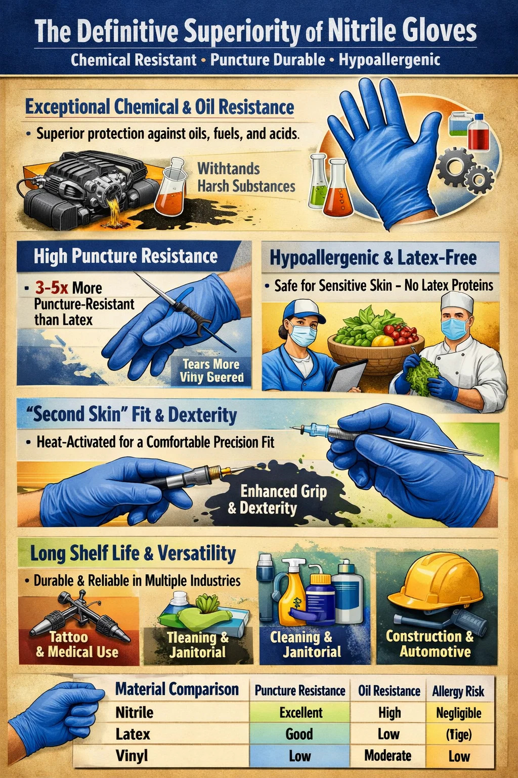 Yếu tố hàng đầu làm nên găng tay nitrile đặc biệt là của họ sự kết hợp chưa từng có của khả năng kháng hóa chất, độ bền đâm thủng và đặc tính không gây dị ứng so với các lựa chọn thay thế bằng latex hoặc vinyl. Không giống như cao su tự nhiên, nitrile là một chất đồng trùng hợp tổng hợp cung cấp một rào cản mạnh mẽ chống lại các sản phẩm, dầu và axit có nguồn gốc từ dầu mỏ, khiến nó trở thành tiêu chuẩn công nghiệp cho các ứng dụng ô tô, y tế và công nghiệp.