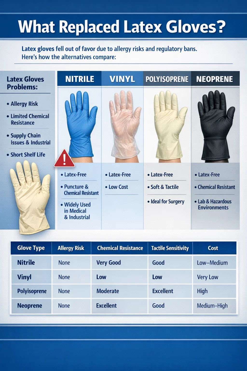 Điều đó nói lên rằng, nitrile không phải là chất thay thế duy nhất. Mỗi loại găng tay vinyl, cao su tổng hợp, polyisoprene và polyme lai đều chiếm những vị trí cụ thể tùy thuộc vào nhiệm vụ, độ nhạy cần thiết, nhu cầu kháng hóa chất và ngân sách. Bài viết này sẽ trình bày chi tiết tất cả chúng - giải thích lý do tại sao sự thay đổi từ latex lại xảy ra, các lựa chọn thay thế mang lại những gì và cách chọn loại phù hợp cho trường hợp sử dụng cụ thể của bạn.